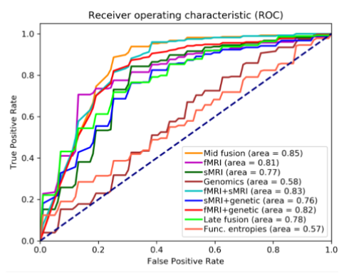 For comparison purposes, multiple baseline models were implemented: unimodal models (fMRI-based model, sMRI-based model, and genetic data-based model) and bimodal models with different combinations (sMRI+ fMRI, SNPs+sMRI and SNPs+ fMRI). Furthermore, for the models integrating the three modalities, different data fusion techniques were implemented (mid fusion and late-fusion). As shown in Table 5 and Figure 6, the multimodal model integrating functional MRIs, structural MRIs, and SNPs using a late fusion strategy outperformed the unimodal neural networks and the other baseline models in schizophrenia classification, achieving ag 0.85 ROC with an accuracy of 88%.