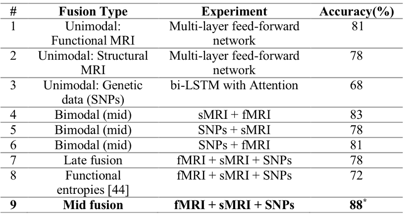 The joint features that are input to the latter network are obtained from a weighted fusion of the latent features from the three input modalities. The approach adopted here is a layer-level or intermediate fusion as it is aggregating the latent features from sMRI, fMRI, and SNPs as input to the final subnetwork.
