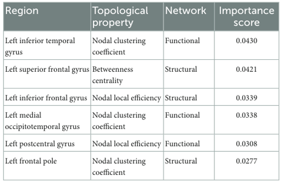 Moreover, a permutation-based method was used to compute each feature’s importance score and, hence, identify the most important brain features. As shown in Table 1, six most predictive brain regions involving both function and structural networks were identified, which emphasizes the importance of combining functional and structural imaging modalities.