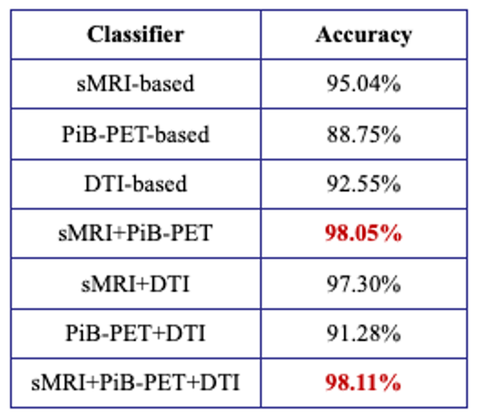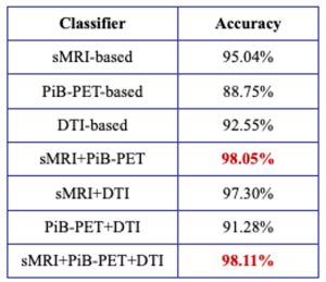 The motivation behind this research paper is to explore whether combining different imaging modalities can provide better insights that could improve early detection approaches to diagnose Alzheimer’s disease. For Alzheimer’s disease classification, the authors conducted a comparison of all possible combinations involving three essential imaging modalities: diffusion tensor imaging (DTI), structural magnetic resonance imaging (MRI), and Positron Emission Tomography (PET).