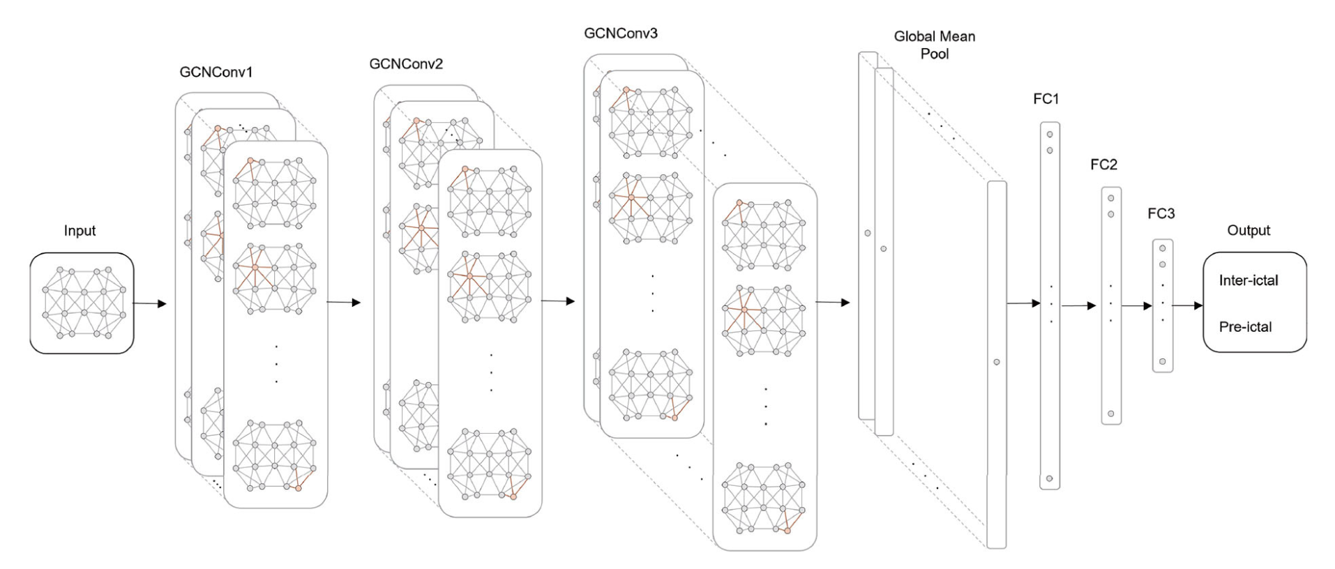 The proposed GCN architecture is shown in Figure 12. It comprises three GCN convolution layers, a global average pooling layer, followed by three fully connected (FC) layers. The FC layers process the information, leading to label probability and class predictions, which are generated through the Sigmoid activation function.