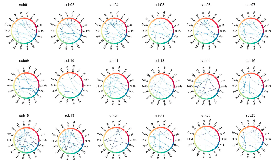 Jia et al. 2022 also presented the chord diagrams (Figure 13) that can be used for seizure focus localization. However, they did not explain the clinical interpretation of the 18 patient's diagram they presented.