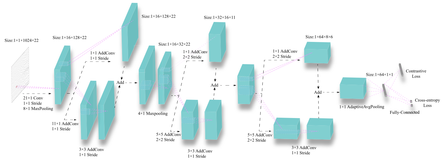 The proposed Adder Network and Supervised Contrastive Learning (AddNet-SCL) architecture, illustrated in Figure 8, builds upon a CNN backbone with added residual connections. Using raw EEG data image as input, the network predominantly employs additive convolutions instead of using only traditional multiplicative convolutions, resulting in the creation of AddNet. They applied a hybrid cross-entropy – supervised contrastive loss (Equation 2) on the 64-dimensional feature vector for classification after the third convolutional layer.