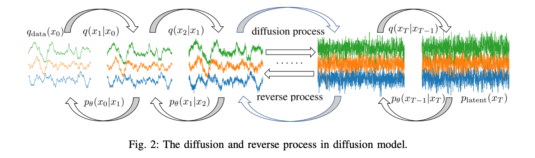 Various methods exist addressing the issue of unbalanced EEG data, where there is more recorded interictal periods compared to preictal and ictal ones. Dealing with this problem, some papers use data augmentation or downsampling of the interictal data. However, these methods do not generate new data or might lead to the loss of important information. An innovative solution from the third paper by Shu et al. 2023 introduces a data augmentation method using a generative diffusional model. The diffusion process is illustrated in Figure 14. First, in the forward/diffusion process, random noise is added to the data, followed by the reverse/denoised process to rebuild brand-new samples with the same distribution as the original data. Equation 8 and Equation 9-10 express the diffusion and reverse diffusion processes, respectively.