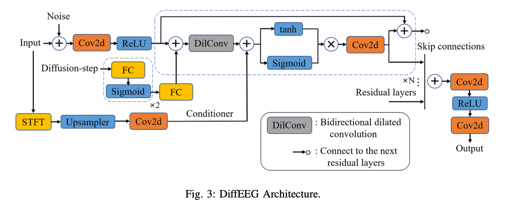 Figure 15 shows the proposed diffusional model, DiffEEG. This architecture comprises a stack of N residual layers with skip connections. As input, the network uses EEG signals segmented into 30-second intervals, and as conditioners, Short-Time Fourier transform spectrograms of these segments. In order to get the same form in the time domain as the EEG inputs, the STFT spectrogram is upsampled using two layers of transposed 2-D convolution. In each residual layer, the conditioner is introduced as a bias term for the dilated convolution before the gated-tanh nonlinearities. Before being fed into two convolutional layers, the skip connections from every residual layer are summed together.