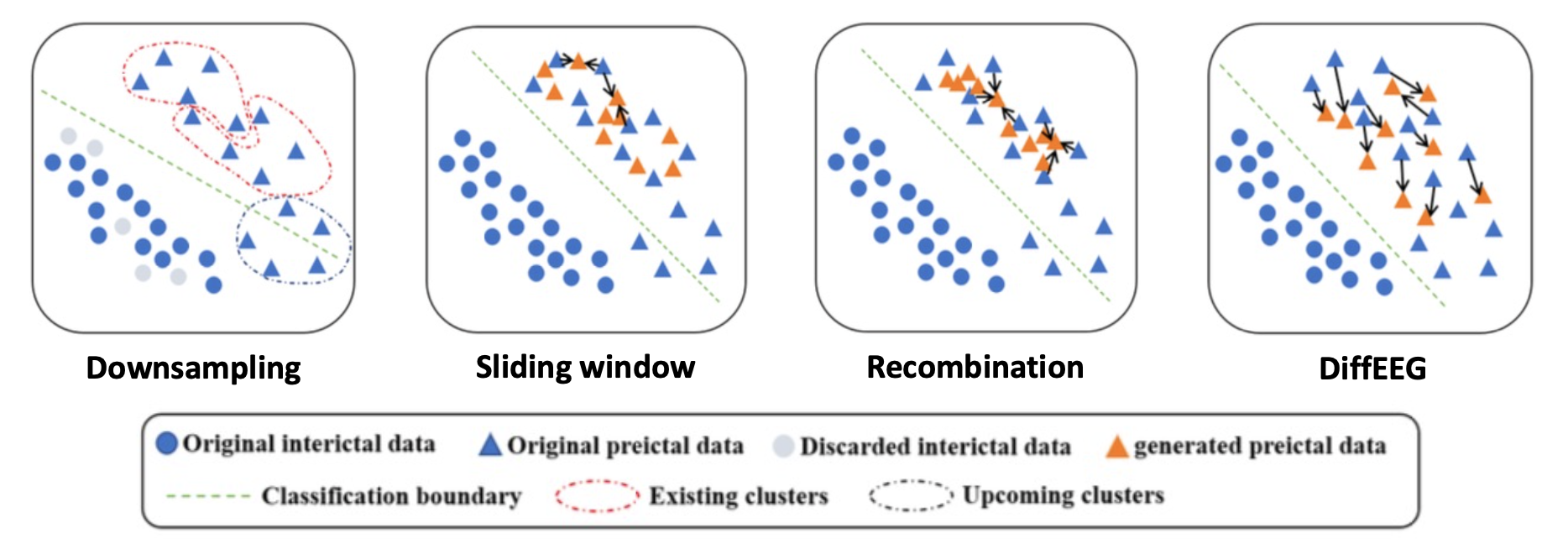 In Figure 16, a comparison of data augmentation techniques and downsampling with the proposed method illustrates the strengths of the DiffEEG. Downsampling of interictal data, as seen on the left side, might result in losing valuable information and may limit the dataset size, which can negatively affect the model performance due to overfitting. In the sliding window method, an overlapping window is applied through the signal of each seizure period. In the recombination method, each seizure period is split into segments and the segments form the same seizure periods are recombined randomly to create new artificial samples. Therefore, methods such as sliding windows with overlap or recombination do not generate new samples. However, the proposed diffusion model generates new samples, maintaining the original data distribution, as illustrated on the right.