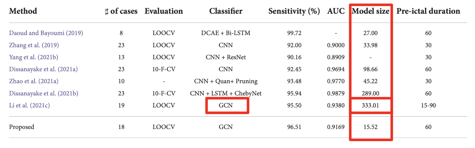 In the second presented paper about the lightweight GCN architecture, Jia et al. 2022 stated that CNN and RNN models used for seizure prediction do "not take into account the structural connectivity characteristics of EEG data, so a large number of model parameters requires more storage and computational consumption when automatically extracting features.” This statement is a bit confusing and suggests that the GCNs, they also utilized in their method, require less storage and computational consumption. However, later in the paper they present Table 4, where from different models, a GCN model has the largest model size (the unit of the model size is not indicated).
