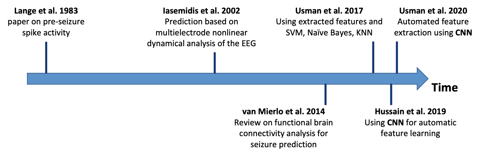 The active research on epileptic seizure prediction began in the 1980s. For many years, seizure prediction relied on statistically evaluating various parameters of the EEG signal and monitoring changes in brain activity. With the emergence of machine learning, the focus has shifted to classifying extracted features using methods such as Support Vector Machines (SVMs). However, due to the complexity of the EEG signal, extracting these features requires clinical expertise. With the development of deep learning techniques, such as Convolutional Neural Networks (CNNs), automatic feature extraction has became possible, and nowadays, these methods are the major focus of active research. Figure 5 illustrates a timeline with selected state-of-the-art papers on epileptic seizure prediction from the 1980s to recent years.