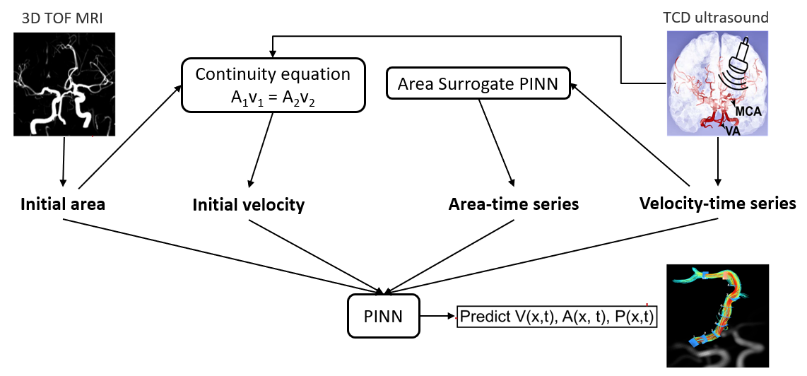 The input for the PINN model consists of the information from the TOF MR angiography and TCD ultrasound. The first method provides spatial information in the form of a cross-sectional area of blood vessels. The second method provides the velocity-time data of some specific locations in the blood vessel architecture. Both these values are initial values of area and velocity. The PINN model aims to predict the velocity, area, and pressure at some time point "t" which is validated by using the 4D flow MRI data.