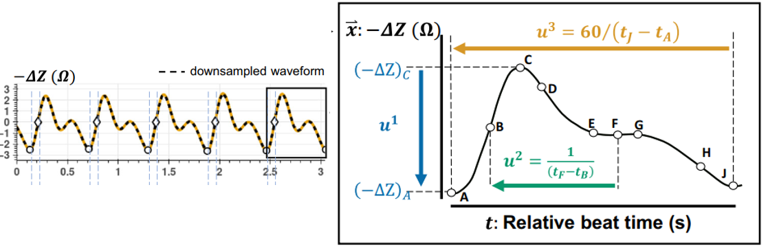 The bioimpedance signal measured from wearable sensors acts as the PINN input and predicts the blood pressure of the systole (left heart ventricle contraction). Sel et al. extracted three features from the bioimpedance signal to improve the network performance and fed them along with the bioimpedance signal. For feature extraction, the bioimpedance signal is segmented into multiple cardiac cycles, which are repeated over time to make the complete signal. Three features are then extracted from each cardiac cycle: