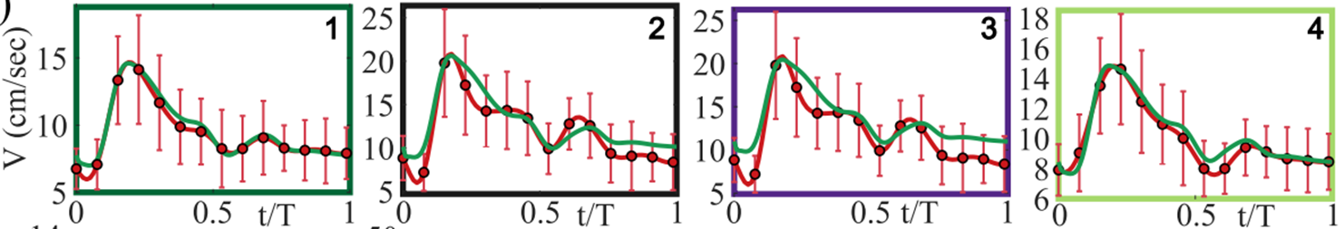 The authors tested the model at different locations in the vascular architecture and found reasonable agreement between the PINN model predictions and the 4D flow MRI data, as shown in Figure 5.
