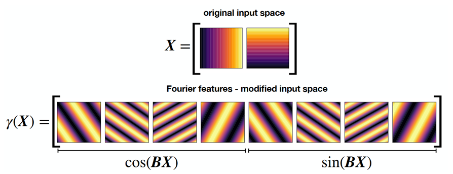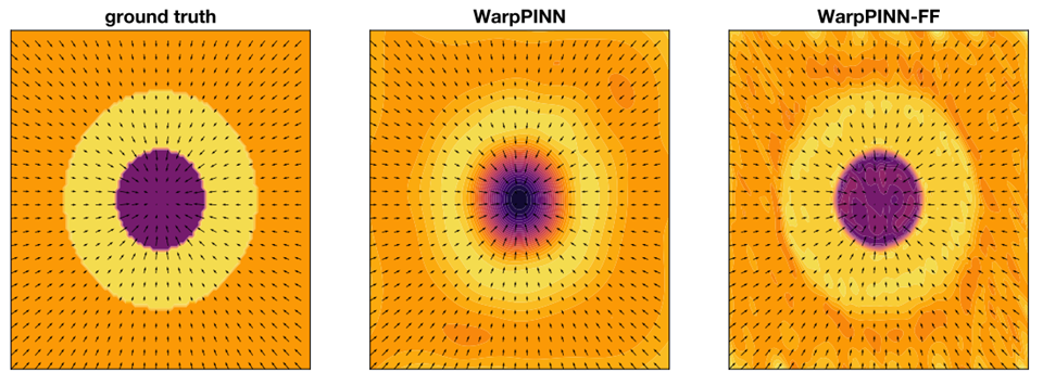 The results of PINN prediction are shown in Figure 11. On the left is the ground truth image, in the middle is the PINN prediction without the Fourier transform, and on the right is the PINN prediction with the Fourier transform. The prediction with the Fourier transform has much better boundary differentiation because the higher frequencies included in the input allow the neural network to better capture the sharp changes in the deformation field at the boundaries, which are difficult to represent with low-frequency components alone.