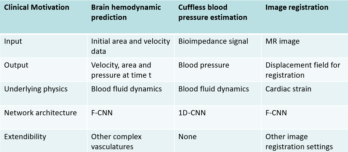This blog introduces physics-inspired neural networks (PINNs) to solve dynamic and complex medical systems. Three papers with different clinical motivations are compared based on their input, output, underlying physics and network architecture (Table 1).