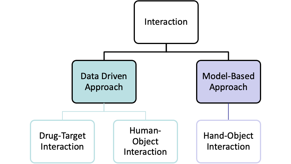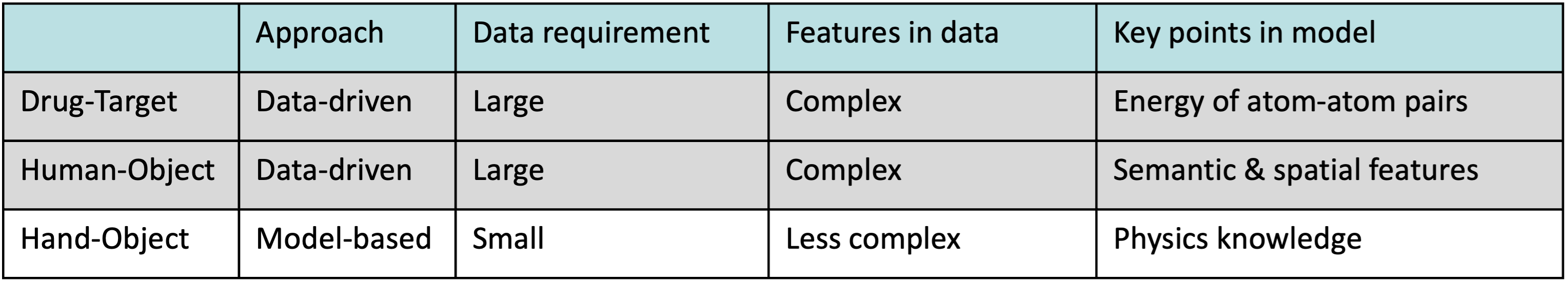 In my opinion, a data-driven approach is appropriate for drug-target and Human-object interaction since these domains involve complex and diverse data, making it challenging to manually extract relevant features. In the case of drug-target interaction, incorporating prior knowledge, such as the binding affinity of atom-atom pairs, can enhance the generalization capabilities of the model, allowing it to make more accurate predictions. For human-object interaction, the reduction of object-action candidates and the incorporation of semantic and spatial features are essential strategies for improving the model's performance.