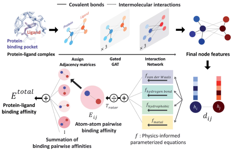 This model gets the input of a protein-ligand complex and predicts the binding affinity (Energy) of a protein-ligand complex from a sum of atom-atom pairwise interactions. The input is composed of two parts, molecular graph G(H, A) and Dij distance between the atom pairs. In a molecular graph, H represents node features and A represents the Adjacency matrix. Gated graph attention networks (Gated GAT) update the adjacency matrix of covalent bonds and Interaction network updates the adjacency matrix of intermolecular interactions. The final node features will then feed into physics-informed parameterized equations to train the variable in the equations. The output is total protein-ligand binding affinity summing from all atom-atom pairwise binding affinity.
