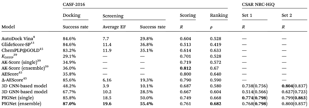 They use two datasets CASF-2016 and CSAR NRC - HiQ. And four metrics docking (find out native bind pose), screening (identify specific binding ligand), scoring (correlation between predicted and experimental results), and ranking (order drugs binding ability to targets) power to evaluate the model. The results show that the PIGNet model has better results in docking, screening, and ranking. We could see that the AK-Score model has a better result in scoring, but it has a bad result in docking. This means the model couldn’t differentiate different binding poses which means the model didn’t have good generalization ability.
