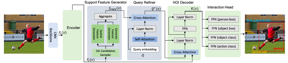 In support feature generator, the OA candidates sampler will first take the encoder’s output as input. Predict and select the top-K (object, action) candidates without localization. And then use these OA candidates to generate semantic and spatial features. In the semantic feature generator, they use a CLIP text encoder to compute the semantic representation of each pre-selected OA candidate and then project these features to the image feature space. In the spatial features generator, they first create a spatial map (2*B*B size binary map for human and object bounding box) for each OA label. Pass the spatial map to 2 convolution layers and then project to image feature space. Finally, aggregate semantic and spatial features with elementwise multiplication.