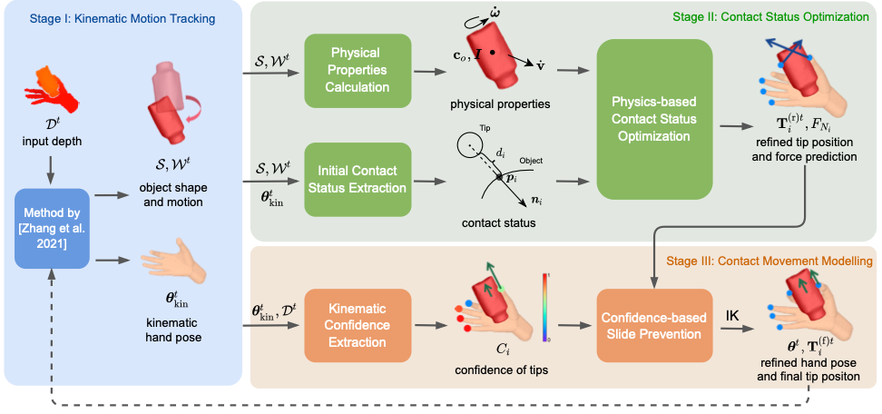 They propose a physics-based optimization method for refining contact status optimization (Predict contact force) and contact movement modeling