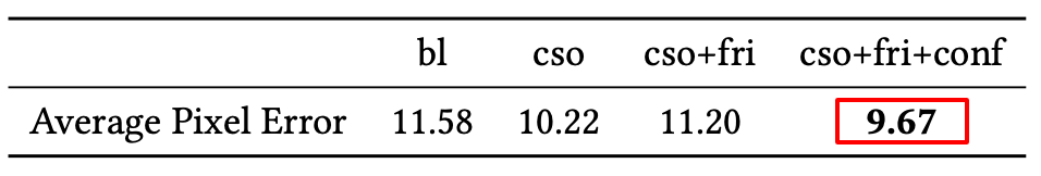 The average pixel error from cso+fri+conf (the paper method) is lower than bl (pure kinematic motion tracking).