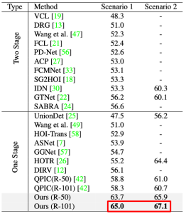 - The two-stage approach first localizes the instances and then predicts the interaction of instances. The main challenge is that off-the-shelf object detectors do not identify the interaction between these items and it’s time-consuming to go over all pairs of person and object.