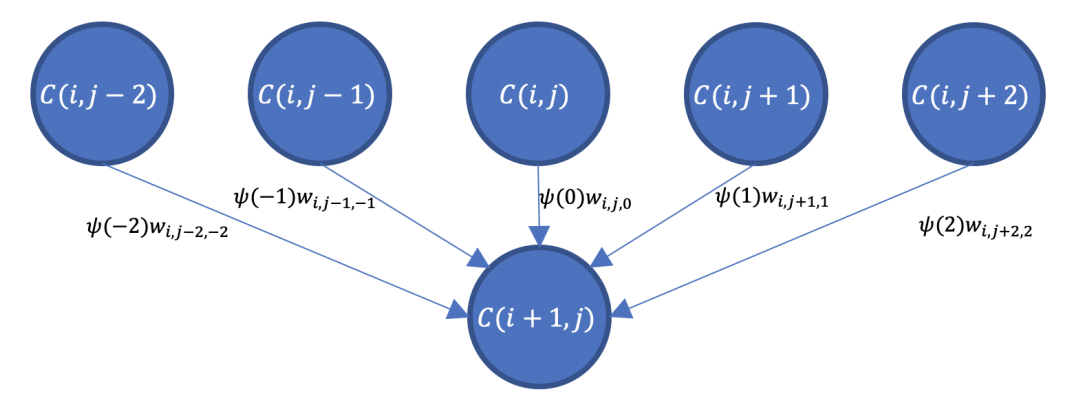 C(i+1,j) = \sum_{k=-\kappa}^{\kappa} \psi(k) w_{i,j+k,k} C(i,j+k) (4)