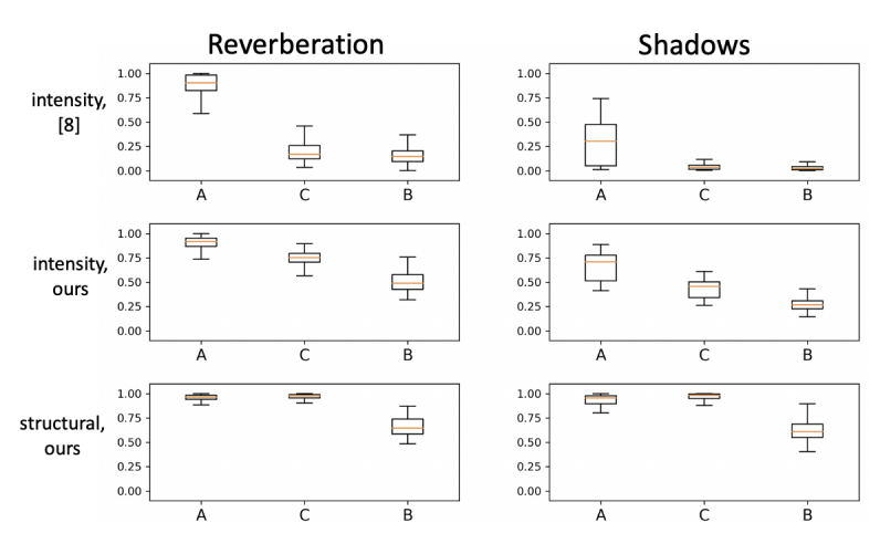 Quantitative Results: The median values of the confidence in different patches of 20 images were calculated. The intensity and structural confidence values follow the pattern: C_{int}(A) > C_{int}(C) > C_{int}(B) and C_{str}(A) \approx C_{str}(C) >> C_{str}(B) . The structural confidence median values were about 0.6, much lower than the values in patches A and C, which were close to 1. This indicates that the structural confidence successfully differentiated artefact patches from non-artefact patches. Moreover, the intensity confidence had the lowest value in patch B and highest in patch A and C, successfully modelling the attenuation in contrast to the original random walks approach (denoted in the image as intensity, [8]).