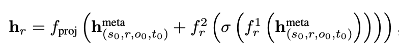 3.1.2.1. Meta-information extractor: The objective of this part is to Extract meta-information about a sparse relation (r) from its support entities (s0, o0). The time aware entity representations h(s0 ,t0 ) , h(o0 ,t0 ) of s0, o0 are derived according to formula 1, where N ̃s0 and N ̃o0 represents the filtered neighborhood , d is the dimnetion of representations and Wg is a weighted matrix that processes the information in graph agreggation. f is a layer of feed-forward neural network. δ1 is a triangle parameter deciding how much information from the temporal neighbours is included in updating entity presentation and σ is an activation function. (This information has been replicated exactly from the formula explanation in the referenced paper [2])