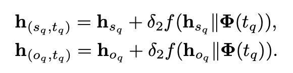 3.1.2.3. Metric function: Computes the plausibility scores for query quadruples related to the sparse relation r according to formula 3. hsq ∈ Rd and hoq ∈ Rd denote the time-invariant entity repre- sentations of sq and oq , respectively. δ2 is a trainable parameter controlling the amount of injected temporal information.