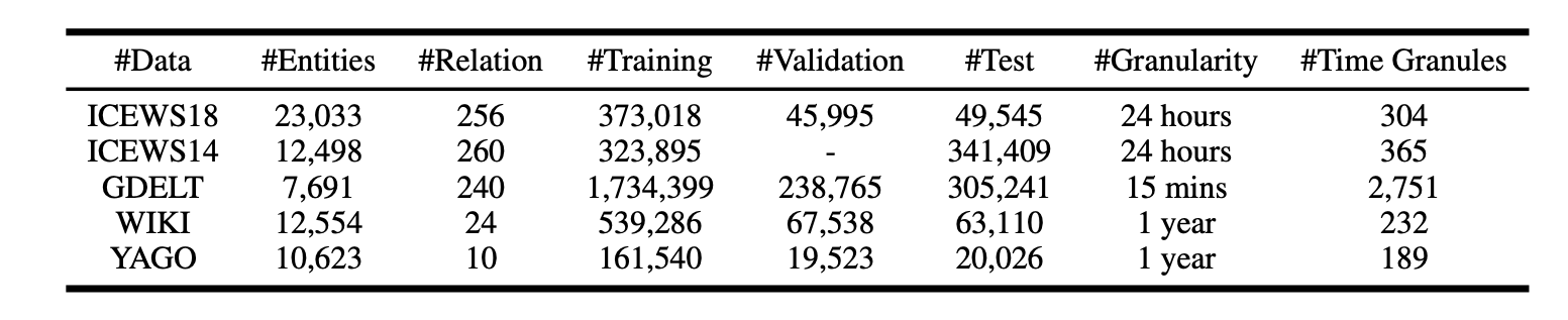 This study employs five benchmark datasets, as detailed in Table 3, to assess the performance of the GenTKG model under diverse scenarios.