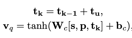In formula 5, the term tk is updated based on the previous time step tk−1 and a temporal update tu. . The index vector vq is then generated using a hyperbolic tangent activation function applied to the weighted sum of subject entity s, predicate p, and time step tk contributing to the Copy mode's mechanism in enhancing the probability estimation for object entities from the historical vocabulary.