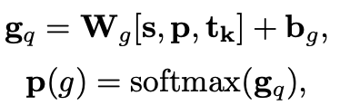 According to formula 6, The Generation mode involves the generation of an index vector gq, achieved through a softmax function applied to the weighted sum of subject entity s, predicate p, and time step tk . Then the softmax function is applied to gq to obtain p(g), representing the predicted probabilities across the entire entity vocabulary. Analogous to p(c) in the Copy mode, p(g) signifies the model's estimation of probabilities for the entire entity set. The maximum value within p(g) corresponds to the object entity predicted by the model in the comprehensive entity vocabulary.