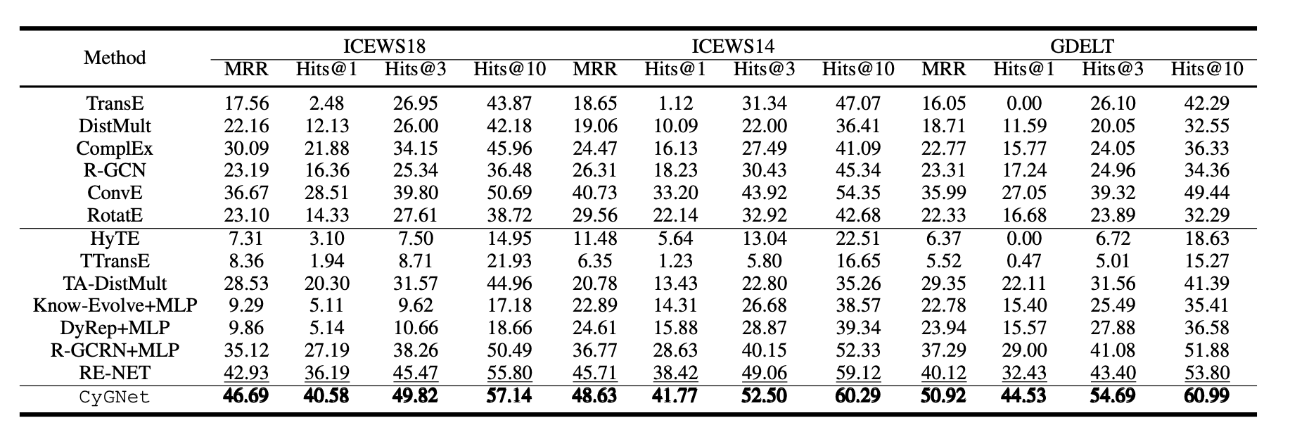 Existing methods often overlook these evolution patterns in TKGs. CyGNet is designed to predict future facts while considering recurrence patterns in TKGs. CyGNet is inspired by the copy mechanism.