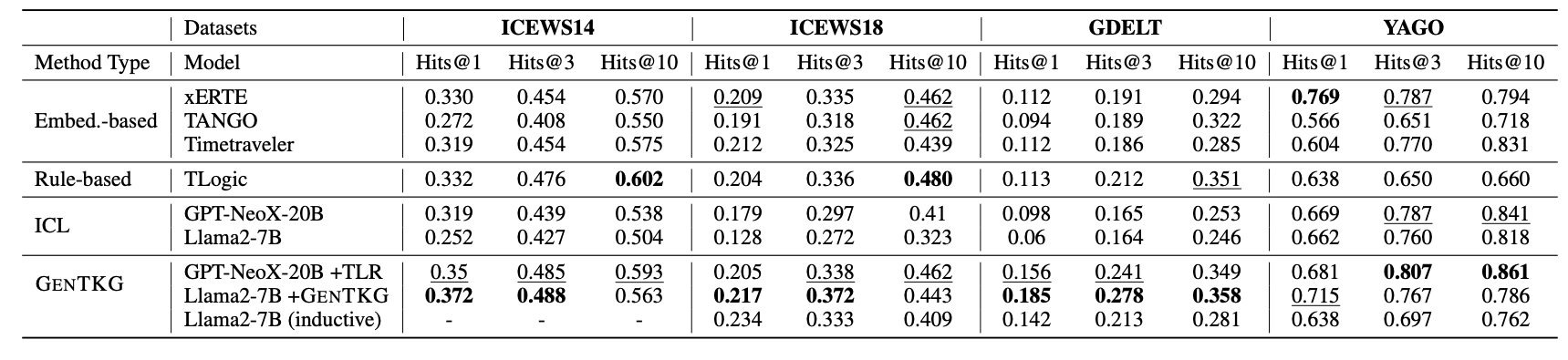 As depicted in table 5, the application of GenTKG with a robust language model demonstrates superior performance compared to the majority of models in their benchmark datasets.