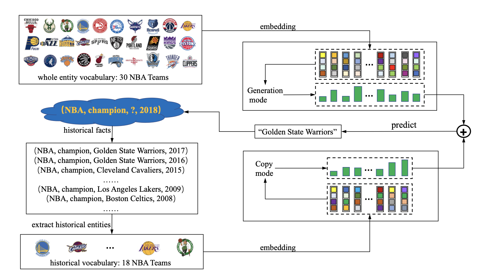 Figure 4 depicts CyGNet's copy-generation mechanism in action. Taking the example of predicting the NBA champion in 2018, CyGNet acquires embedding vectors for each entity (represented by the color bar). It employs both inference modes to determine entity probabilities, shown as green bars, considering historical context or the entire entity vocabulary. Notably, "Golden State Warriors" is present in both Copy and Generation modes