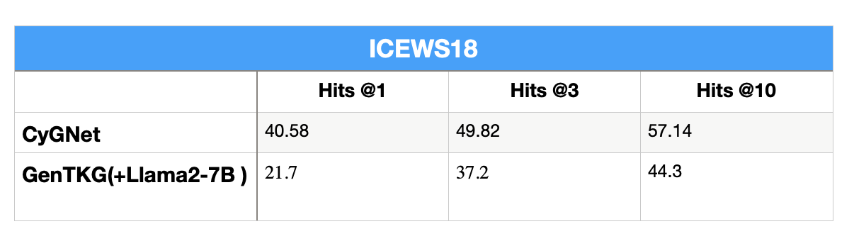 According to Table 5 , CyGNet outperforms GenTKG(+Llama2-7B) across all evaluation metrics on the ICEWS18 dataset. Specifically, CyGNet shows a significantly higher accuracy in predicting the correct entities at the top ranks, as indicated by the superior performance in Hits@1, Hits@3, and Hits@10 when compared to GenTKG(+Llama2-7B). These results suggest that, based on the ICEWS18 dataset, CyGNet demonstrates a notably better predictive capability than GenTKG(+Llama2-7B).