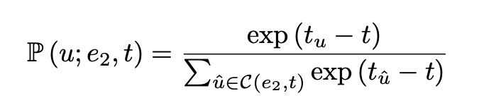 Formula 7, represents a probability distribution used in the retrieval phase of GenTKG. Here, P(u;e2,t) is the probability of transitioning to entityu given the current entity e2 and time t. The numerator exp(tu−t) is the exponential of the time difference between the target entity u and the current time t. The denominator sums the exponential time differences for all candidate entities u′ adjacent to the current entity e2 at time t, creating a normalized distribution that prioritizes entities closer in time during the sampling process