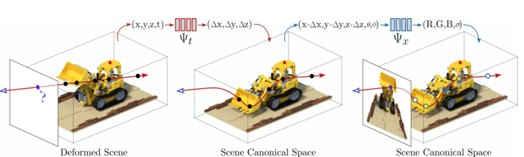Similar to “Nerfies”, the Canonical Network in D-NeRF is an MLP, which encodes the scene in the canonical space. It takes a 3D point and a viewing direction and gives colour and density, Ψ_x:(x,d)→(c,σ). The canonical configuration acts as an anchor interconnecting all images to form a scene that stores the information of all points in the images. This allows needed information to be retrieved when synthesising scenes [2].