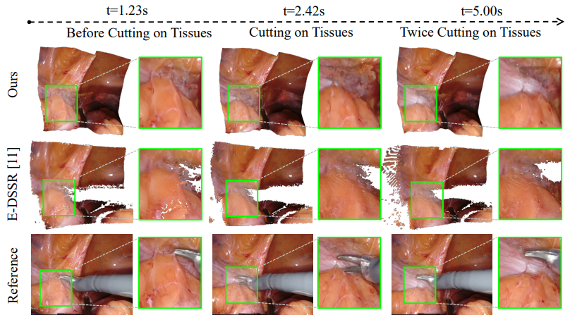 When testing EndoNeRF's peformance in cutting soft tissues, reconstruction results show its capability to track the procedure's details. This results from the strong displacement fields representation by the NN. Bypassing tool occlusion issues appears possible due to the neural implicit field's interpolation property and mask-guided ray casting. Whereas, the compared method does not seem capable of tracking detailed changes nor patch all the occluded areas, as shown in Fig. 13 [14].