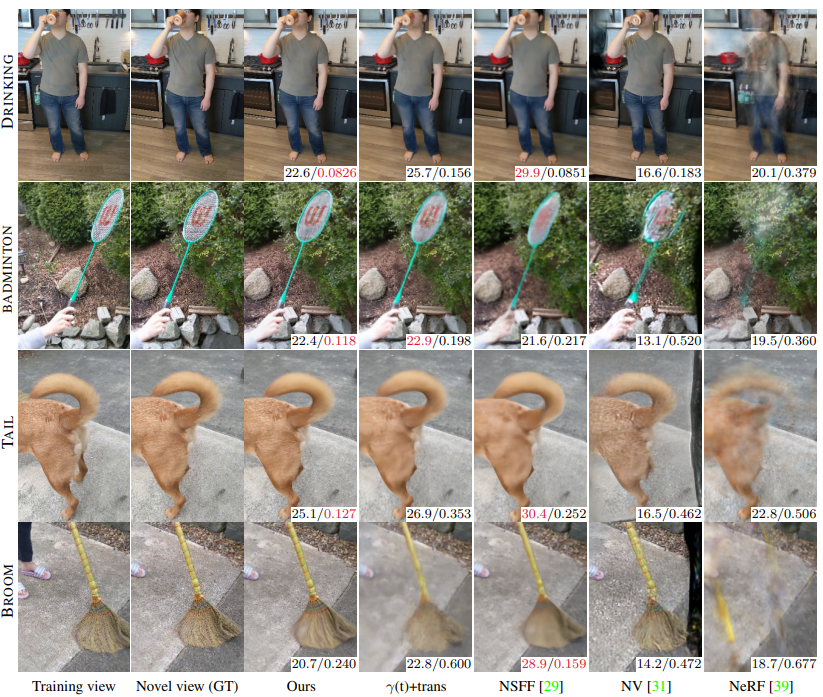 Figure 8. Qualitative evaluation of Nerfies with PSNR/LPIPS displayed (the better performing in red) [5].