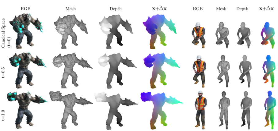 D-NeRF uses one camera to train, without 3D ground truth supervision, on monocular data with time as an additional input. The learning process is split into encoding the scene into a canonical space and mapping the canonical representation into the deformed scene at a specific time. This allows the method to control object movement by controlling the camera view and time variable when rendering new images [2]. Unlike structure-from-motion (SfM) methods [7], used in Nerfies, D-NeRF doesn't require a reference known template to acquire the surface geometry [2].