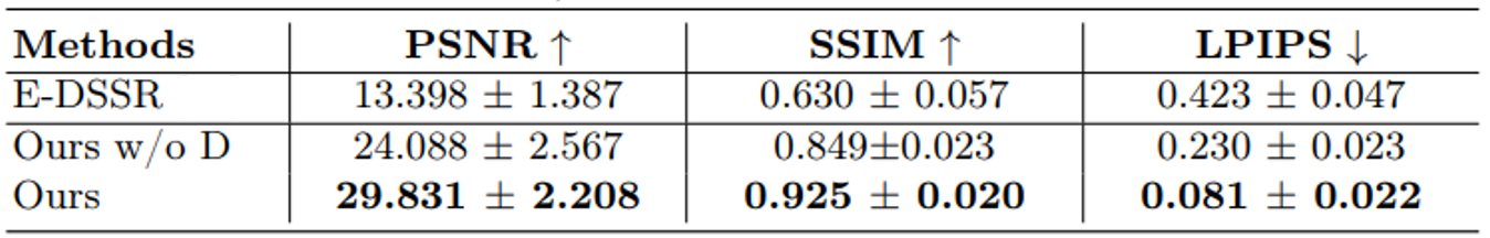 As shown in table 3, EndoNeRF outperforms E-DSSR [16]. When removing the neural displacement field (w/o D), despite the big drop in performance, it still does better than E-DSSR [14].