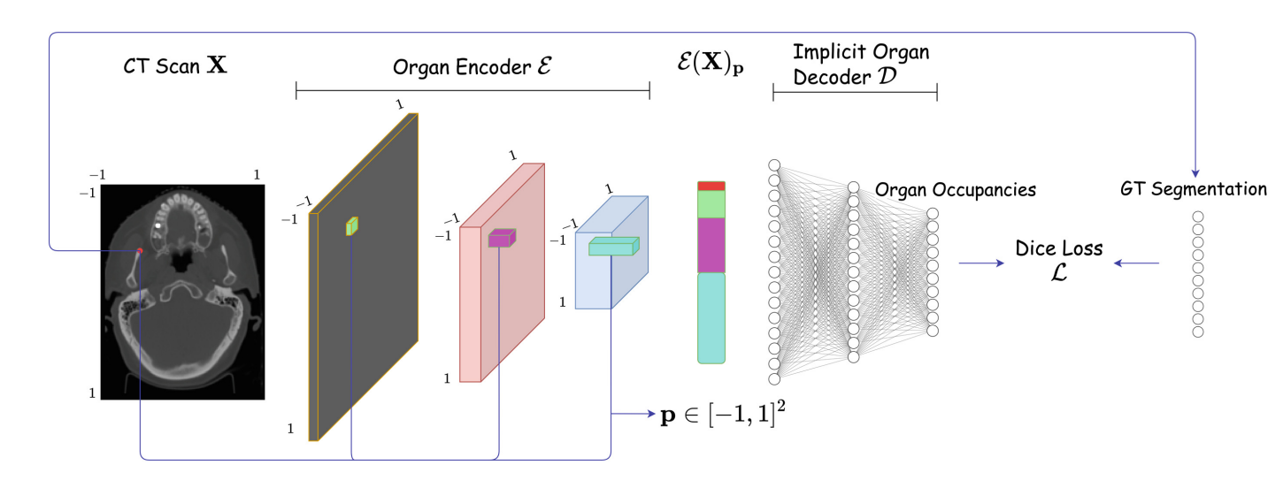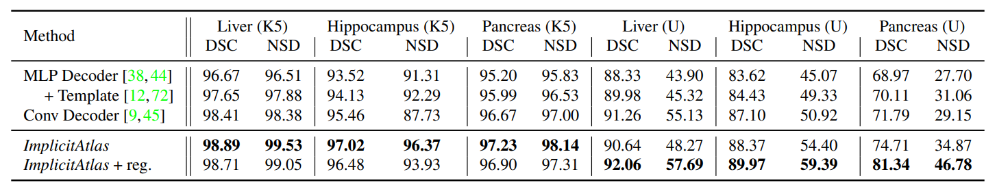 - Converges faster than discrete voxel-based methods when there are size imbalances (organs have different sizes) (e.g. UNet - since it learns voxel distributions, it favors the larger organs and struggles to generate accurate predictions for the smaller ones). It was cited from another paper that INRs based decoders learn shape boundaries whereas CNN decoders learn voxel distributions,