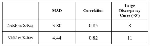 In the first reviewed paper, 3D Ultrasound Imaging with NeRF, the goal of the project was to get a better calculation of Cobb angle than the one currently obtained with VNN. Authors claim, that with NeRF there is a slight improvement in this task and it is evaluated using the correlation with measurements made by radiograph (considered the most precise). They also evaluated the number of large discrepancy curves after curve measurement and noted that NeRF had less of those which is also better than VNN. An important finding of the paper was the suppression of reflections during NeRF training - for soft tissue in the region of interest it is mentioned that the ultrasound propagation and reflection in different