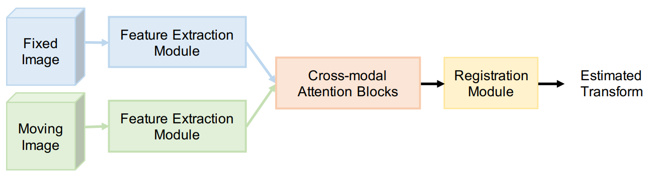 Architecture: The TRUS volume is regarded as the moving image, while the MRI volume is the fixed image. The entire architecture proposed in this paper is as Figure 21. In the feature extraction part, CNN-based networks are built to extract local features of the volumes. Then the author uses the cross-modal attention block to capture the local features and the global correspondences. The output is input into the deep registration network that performs information fusion between modalities to obtain the transform parameters. The registration network is pretty light-weighted since it only consists of three convolutional layers.