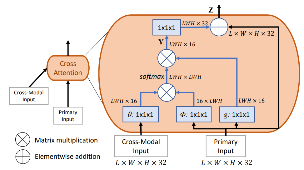 Where c_{i} and p_{j} are features from C and P at location i and j. \theta(∙), \phi(∙) and g(∙) are linear embeddings. f(∙) is exp(∙), and it outputs a scalar that represents the correlations between the features. The output y_{i} is a normalized result of features at all locations of P weighted by their correlations with C at location i. These y_{i} form the matrix Y contains spatial correspondence information between P and every position of C. The final output Z is produced by adding Y and P. As a result, the entry of Z at location k stores the spatial correlation between the primary input feature map and the cross-modal input feature map at location k.