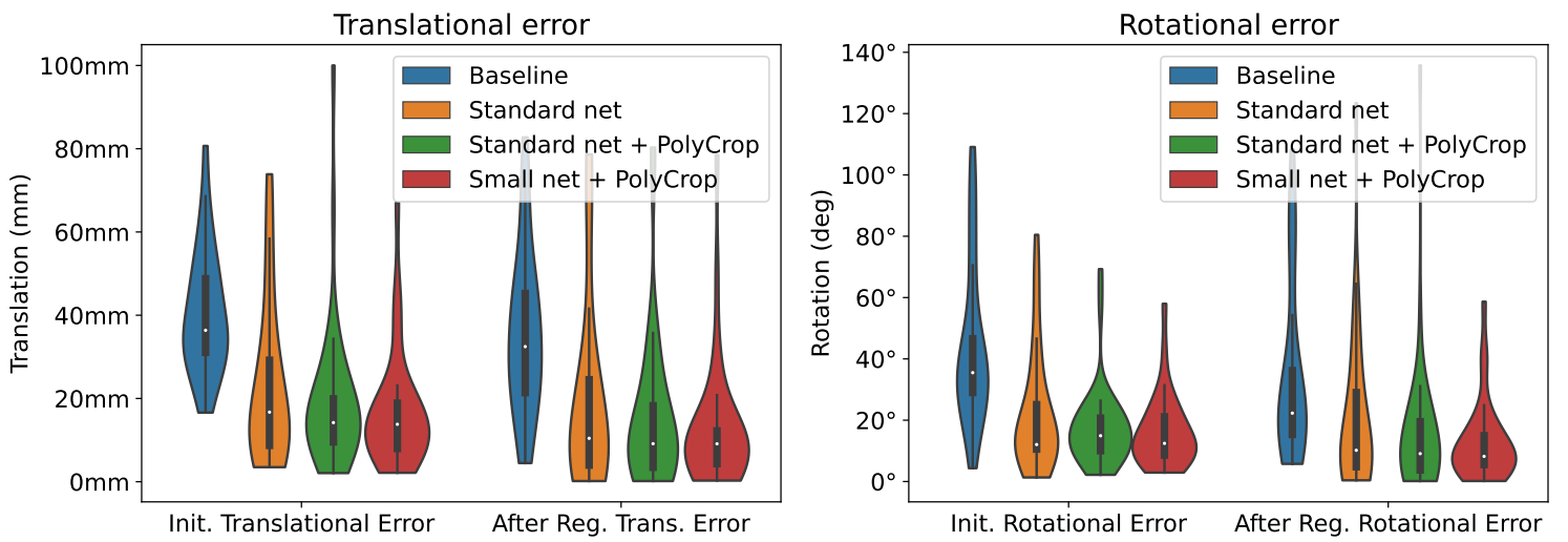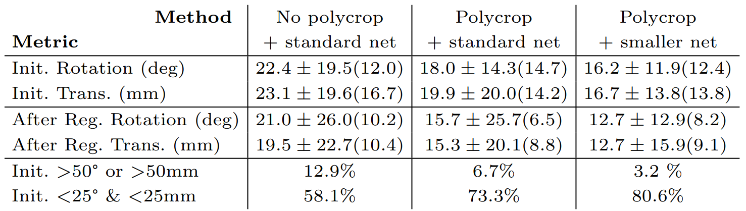 The author further designs an experiment on the PolyCrop technique and the network size. The results are shown in Table 5. It can be concluded that the PolyCrop data augmentation does improve the performance of registration. The smaller network achieves better results on all the metrics except for the median error. This result may be due to the improvement of the over-fitting issue. After all, the network is smaller and has a weaker capability for learning feature representations, and the median error gets slightly higher.