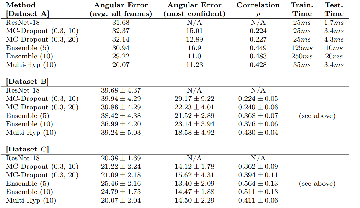 The paper makes a comparison of four kinds of models: ResNet-18, Monte Carlo-Dropout, ensemble, and ResNet-18-based multi-hypotheses network. For orientation estimation, the global errors are greatly higher than most-confident-frame errors, which indicates that the confidence estimation approaches are successful. Generally, ResNet-18-based multi-hypotheses network and ensemble methods work better than MC dropout and ResNet-18. The correlation between the uncertainty and the error of the MC dropout prediction is much lower than that of other models. Considering training and test time, ResNet-18-based multi-hypotheses network achieves the best trade-off.