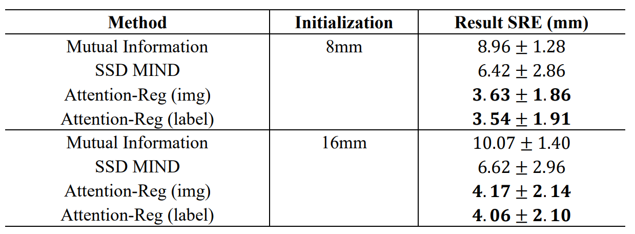 Table 2 shows the comparison of the proposed approach and traditional iterative methods Mutual Information [45] and SSD MIND [46]. As is shown in Table 2, the initial SRE is set to 8mm and 16mm respectively. The experiment result shows that the approach proposed in this paper outperforms those traditional methods. Besides, the network that uses segmentation labels as MRI input achieves slightly better results.