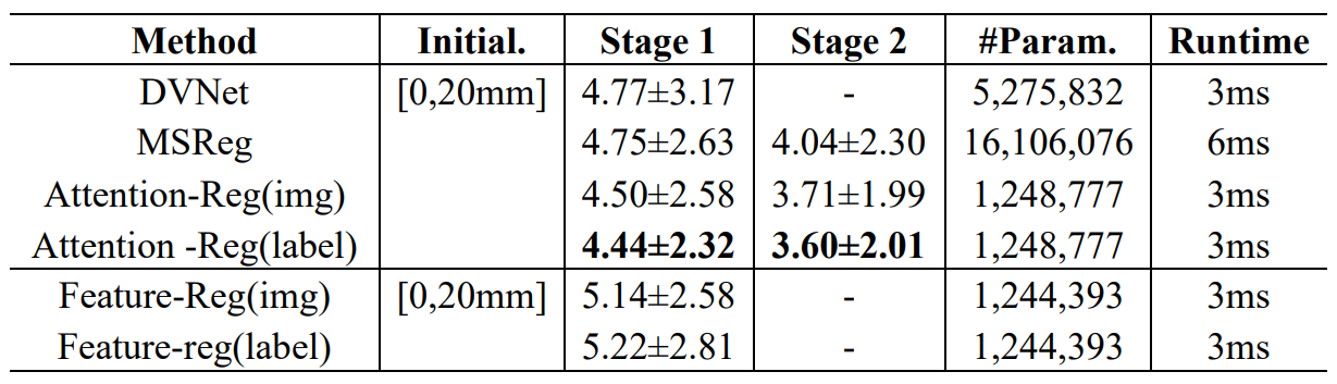 Table 3 shows the results comparing the Attention-Reg with other end-to-end deep learning-based methods MSReg [47] and DVNet [48] for rigid registration. Since MSReg is a two-staged network, the paper trains the Attention-Reg twice on two training sets with different distributions. The model for the first stage is trained and tested on a generated dataset with an initial uniformly distributed SRE within [0, 20mm], whereas the dataset for the second stage is set as a uniform distribution within [0, 8mm]. These networks are concatenated to form a two-staged network. As shown in Table 3, the Attention-Reg outperforms the MSReg, and the parameter number and runtime of Attention-Reg are much less than those of MSReg. This proves the outstanding capability of Attention-Reg to efficiently extract and understand the global correspondences of local features from multi-modal images. The paper also trains the network without the attention block named as Feature-Reg. From the comparison, it can be concluded that the cross-modal attention block has significantly improved the performance.