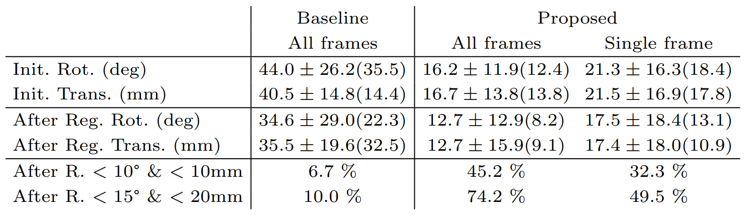 The experiment uses the approach proposed in the paper as the initialization of the registration algorithm in [55]. The baseline set for comparing performance is the approach in [56]. Table 4 shows the comparison results. The author evaluates the method using both a single US frame and an entire sweep. The approach outperforms the baseline in either experiment setup. And the superiority of the approach is proved by statistical analysis.
